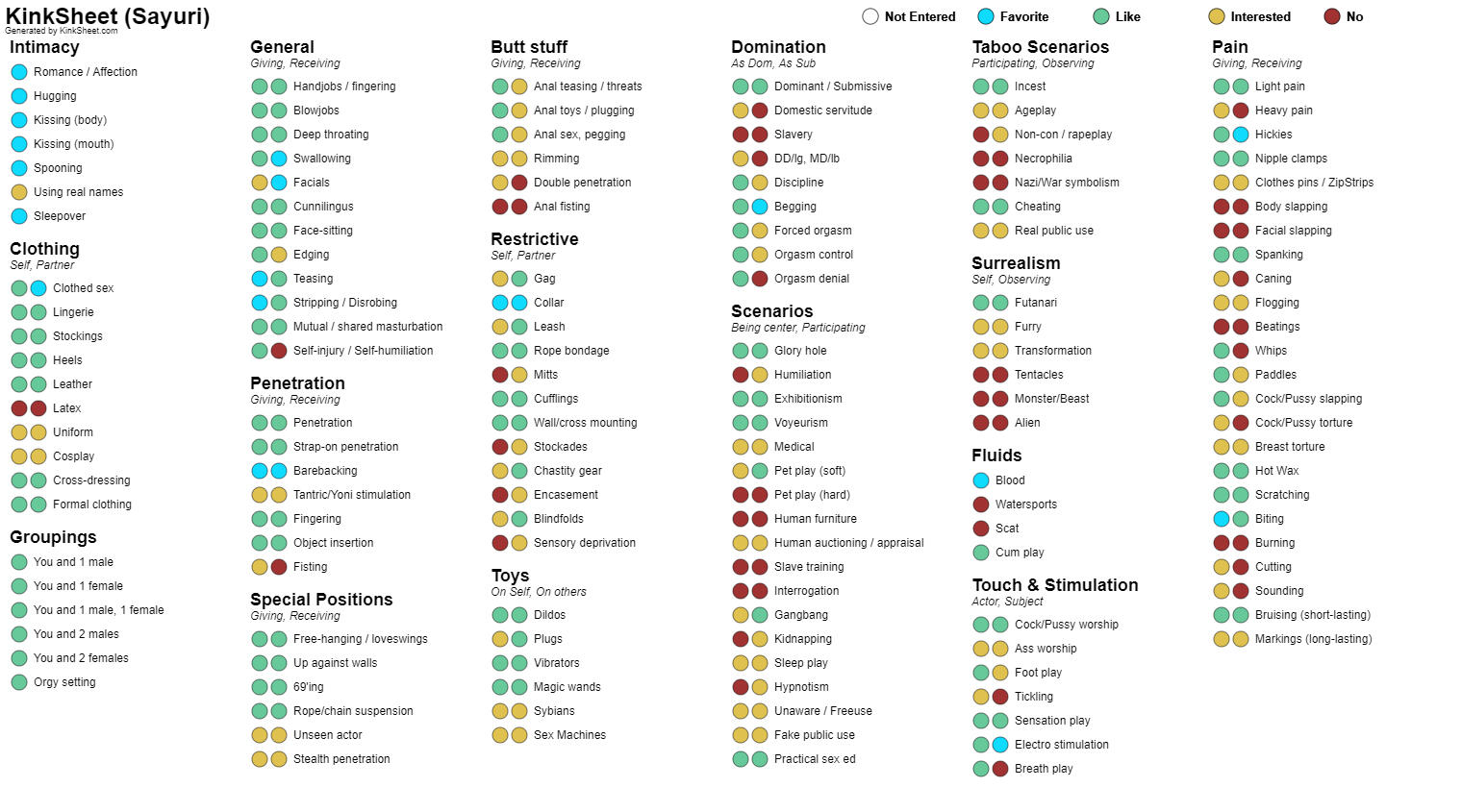 Hard "NO"s: Humiliation, Rape, Non-Con, Necro, Scat, Water sportsSayuri is a Domme, and her style of Domme is one of giving what the sub needs. She prefers to compliment, spoil and dote on her subs. Her expert skills are Shibari/Rope play and total control over her sub. With negotiation, she can do things she does not like to her sub, but be prepared for the most spoiling after-care of your LIFE!